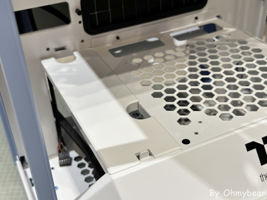 電源倉側邊硬碟安裝位置位於水冷排處,也是可拆卸式的安裝支架,能安裝1顆HDD或SSD,但安裝HDD應該得犧牲水冷排尺寸。